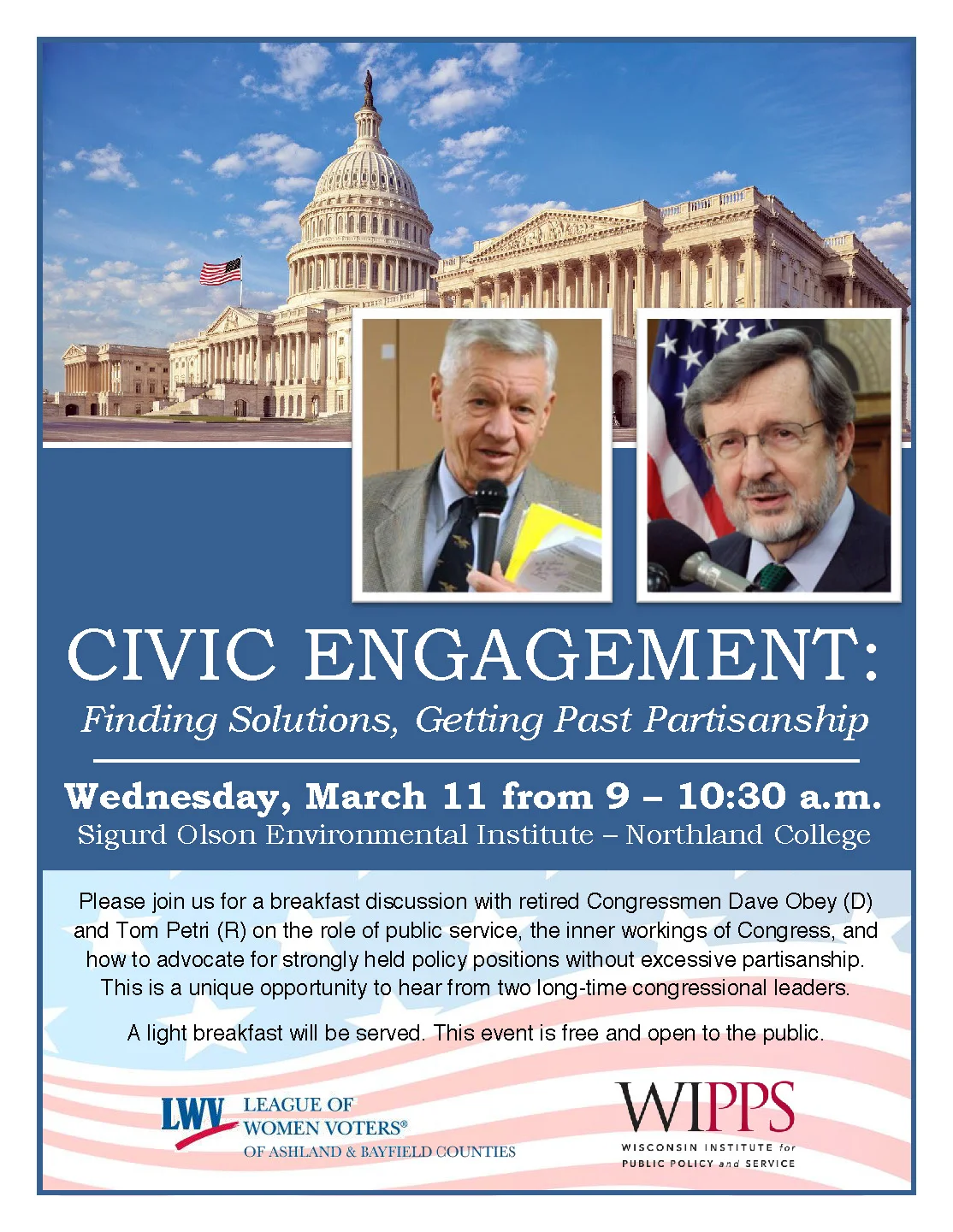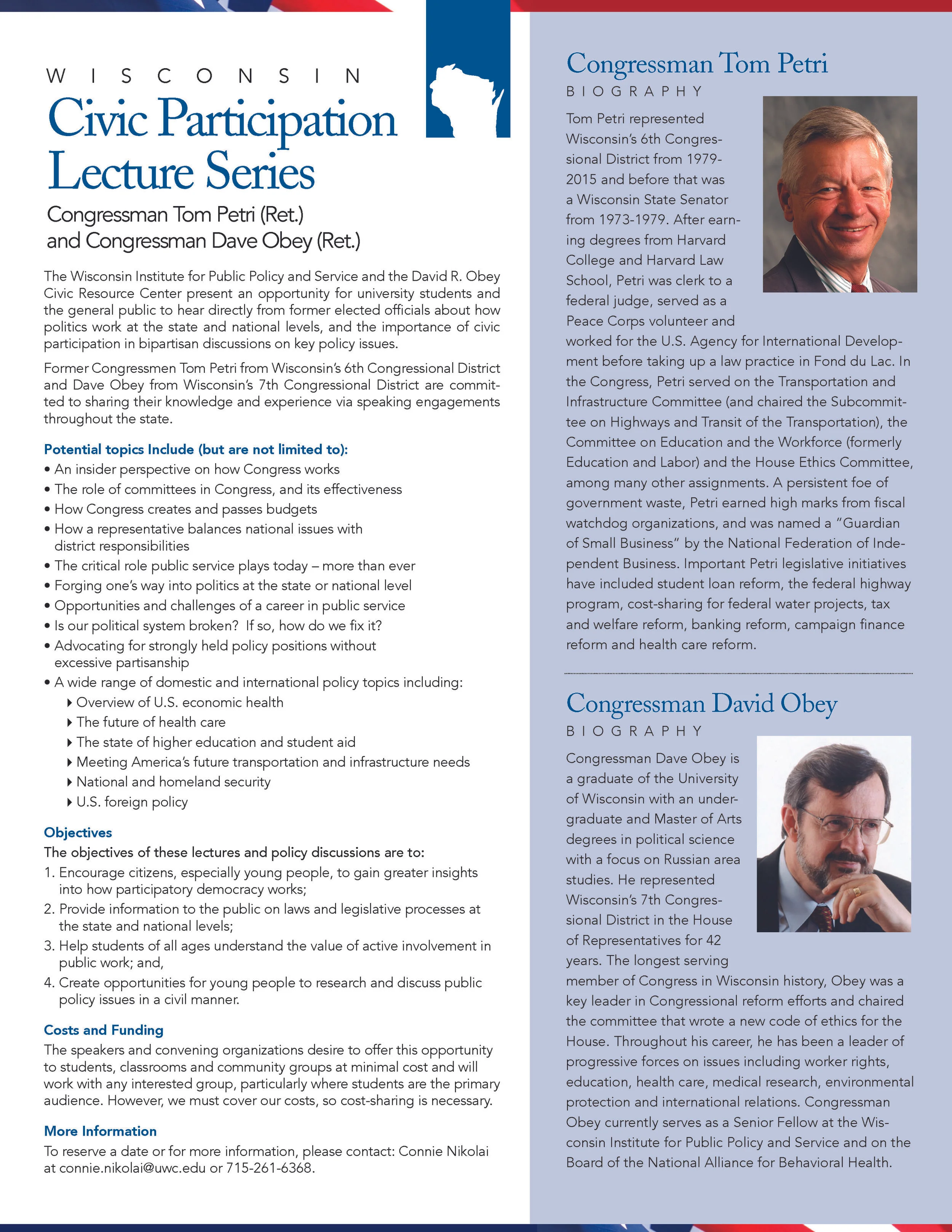 Please join us for a discussion hosted by the Wisconsin Institute for Public Policy and Service with retired Congressmen Dave Obey and Tom Petri. The Congressmen will discuss the importance of civic engagement, public service, and bipartisanship—from an insider's perspective.